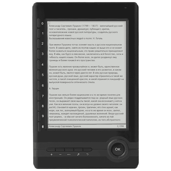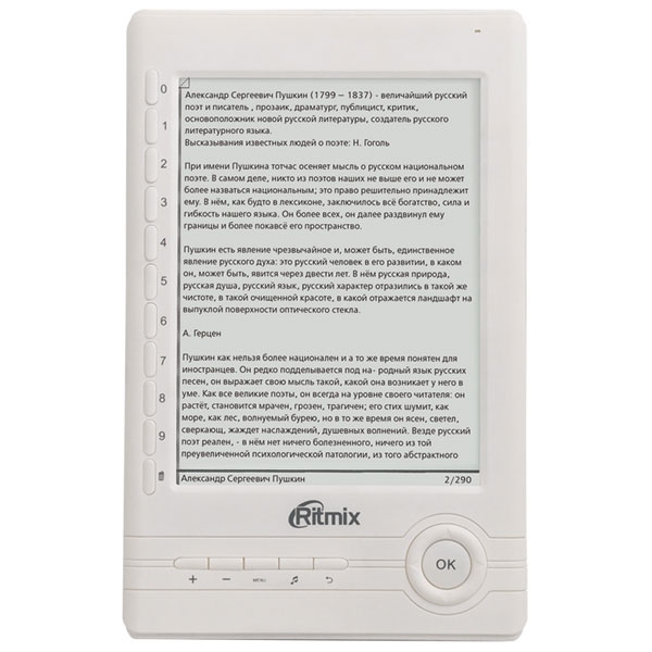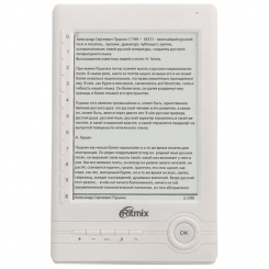 Электронная книга Ritmix RBK-500 - технология экрана - электронная бумага E Ink, диагональ - 6 дюймов, разрешение - 600*800 пикселей. Разъём для карт памяти - карты памяти SD (до 8 Гб включительно). Поддерживает такие форматы книг как: TXT, PDF, FB2, EPUB (DRM free), HTML, RTF; изображения: JPEG. Воспроизводит музыку и видео в формате MP3. В комплект входит - обложка, USB-кабель, зарядное устройство (вход: 100-240В ~ 50/60Гц, 0,2А; выход: 5В 0,5-1А), переходник 2,5 мм – 3,5 мм для подключения наушников, инструкция – записана в памяти электронной книги.